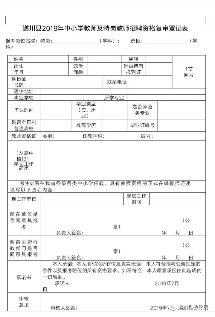 1.《遂川县2019年中小学教师及特岗教师招聘资格复审登记表》(请参加资格复审的考生,下载附表、填写有关信息并使用A4纸打印一份);